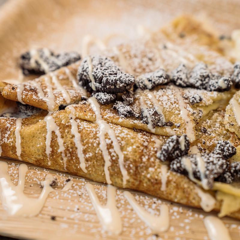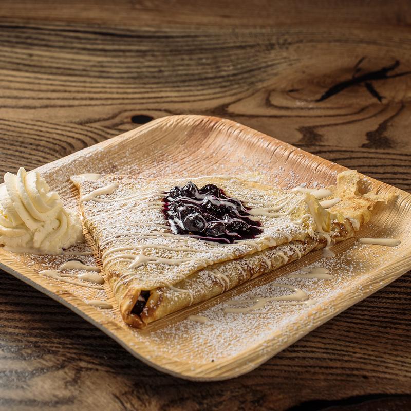 Rose shaped crepe filled with our house-made whipped cream drizzled in our house-made wild berry sauce.
